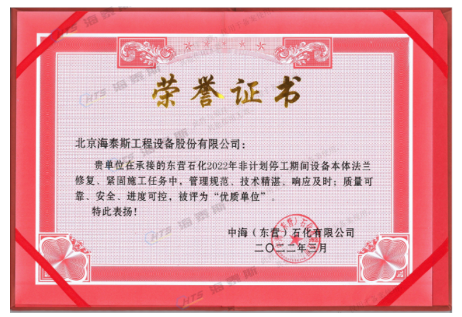 海泰斯獲評“優(yōu)質(zhì)單位”!負(fù)責(zé)的催化裝置、常減壓裝置泄漏法蘭的在線修復(fù)和定力矩緊固施工任務(wù),實(shí)現(xiàn)了“零泄漏”的目標(biāo)。